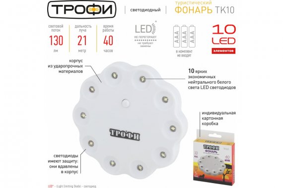 Технические характеристики ТРОФИ TK10 10xLED, 3xAAA Б0003942