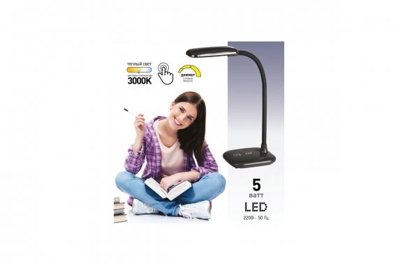 Настольный светильник ЭРА NLED-451-5W-BK со светодиодами (LED) в качестве источников света. Сенсорное переключение. Есть регулировка яркости освещения, 3 уровня. Высота плафона регулируется гибкой стойкой, направление света - поворотом плафона в любом направлении.
