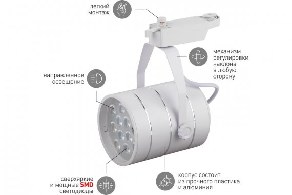 Трековый светильник однофазный ЭРА TR3 - 12 WH светодиодный 12Вт белый SMD Трековый светильник TR3 - 12 WH от компании Эра расставит необходимые акценты в пространстве помещения. Он выделит конкретный объект, создать выразительную подсветку товара. Подобные светильники имеют особый механизм, который позволяет регулировать угол наклона светильника, изменяя стиль пространства в целом. В магазине такие лампы направляют посетителя к конкретному товару, а в офисных open space - разграничивают пространство. Светильник имеет показатель цветовой температуры 4000К, который позволяет человеку чувствовать себя спокойно при данном освещении. Осветительный прибор имеет продолжительный срок службы (около 30000 часов), коэффициент пульсации составляет менее 5%. Светодиодный светильник отлично дополнит любой дизайн, создаст качественные акценты. Большое разнообразие моделей трековых светильников Эра позволит подобрать наиболее подходящий вариант к конкретному помещению.