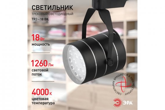 Трековый однофазный светильник ЭРА TR3-18 BK светодиодный SMD 18Вт 4000К 1260Лм черный, Б0032111 - важный элемент создания направленного освещения. Он выполнен в универсальном белом цвете, имеет поворотную часть, чтобы выборочно освещать необходимые объекты.