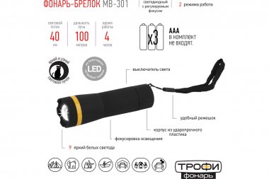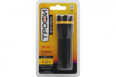 Светодиодный фонарь Трофи MB-301 ручной на батарейках с регулируемым фокусом Трофи MB-301 легкий ручной LED-фонарь для работы, кемпинга и универсального бытового применения. Отличается ярким дальним лучом 100 метров. Имеется фокусировка освещения. Корпус изготовлен из ударопрочного пластика. Фонарь работает от 3 мизинчиковых батареек. Одного комплекта элементов питания хватает на 4 полных часа непрерывного свечения. Простой в управлении, удобный и практически невесомый, Трофи МВ-301 станет надежным помощником, в дороге, на природе, на даче, в гараже.