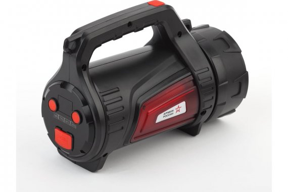 Светодиодный фонарь АРМИЯ РОССИИ PA-702 Шмель прожекторный аккумуляторный красный маяк боковой свет powerpank ЭРА Армия России "Шмель" РА-702 - мощный аккумуляторный фонарь-прожектор с дальностью светового луча почти в полкилометра. 7 режимов работы! Яркие светодиоды последнего поколения. Помимо основного освещения разной яркости, есть два боковых светильника, а также красный аварийный свет. Режимы можно комбинировать, находя лучший вариант освещения для каждой конкретной ситуации. В комплекте поставляется прочный ремень для удобной переноски фонаря на плече, а также зарядное устройство с USB-выходом и microUSB-провод. Провод универсальный - используя его, можно заряжать любые мобильные гаджеты с соответствующим разъёмом. Фонарь отличается необычным дизайном со множеством деталей и выглядит очень стильно. Корпус традиционной цилиндрической формы снабжён устойчивыми ножками, благодаря которым Шмель отлично стоит на любой плоской поверхности. Ручка фонаря рифлёная с внутренней стороны - устройство отлично лежит в руке и не выскальзывает. Кнопка включения удобно расположена прямо под большим пальцем и имеет прорезиненное нескользящее покрытие. Режимы работы основного фонаря: 100% яркость (мощный светодиод 10 Вт), 50% яркость и аварийный режим мигания. Основной фонарь удобно использовать для освещения пути и подсветки дальних объектов. По бокам прожектора расположены светильники (с обеих сторон!), которые идеальны для создания ближнего заливающего освещения. Это актуально на привале или при выполнении бытовых/строительных/ремонтных работ. У каждого из светильников по 2 режима работы - максимальная яркость и эконом-освещение. Включается боковой свет при помощи кнопки на задней части корпуса. Один светильник даёт стандартный белый свет, второй отвечает за аварийное красное мигание. Устройство оснащено литиевым аккумулятором с повышенной мощностью (4500 мАч) - заряд держится свыше 5 активных часов. Имеется световой индикатор, который в процентах показывает уровень заряда и подскажет, когда потребуется очередная подзарядка.