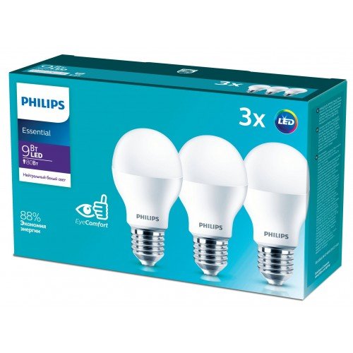 Лампочки светодиодные Philips ESS LEDBulb А55 9Вт 4000К Е27 / E27 груша матовая нейтральный белый свет набор 3 штуки Светодиодная лампа серии Essential разработана для общего освещения и подходит для применения внутри помещений. Экономия до 89% электроэнергии по сравнению с лампами накаливания. Обеспечивает высокую яркость сразу после включения. Безопасна для глаз (соответствует стандартам фотобиологической безопасности)