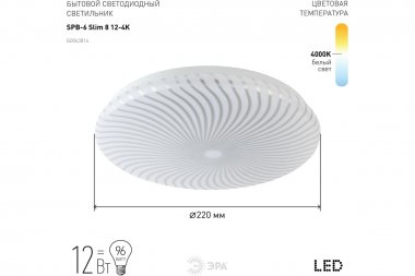 Светильник потолочный светодиодный ЭРА Slim без ДУ SPB-6 Slim 8 12-4K 12Вт 4000K Slim" в переводе с английского означает "изящный". Именно поэтому потолочный светильник SPB-6 "Slim 8" от бренда ЭРА идеальный вариант для создания утонченного стиля Вашего помещения! LED светильник оснащен светодиодом с холодным белым свечением. Благодаря равномерному распределению светового потока и пластику в составе плафона, Ваши глаза будут защищены от прямого света. Цветовая температура 4000 К. Дизайн рассеивателя заслуживает отдельного внимания. Динамичный узор идеально сочетается с круглым плоским корпусом. За счет этого электросветильник придаст гостиной, спальне или прихожей изыска.Мощность 12 Вт и срок службы 30 000 часов позволят долго использовать светодиодную люстру, создавая романтичную атмосферу! Покупайте светильник SPB-6 "Slim 8" и наслаждайтесь каждой минутой, проведенной дома!