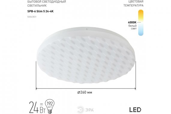 Светильник потолочный светодиодный ЭРА Slim без ДУ SPB-6 Slim 5 24-4K 24Вт 4000K 1800Лм Изящный потолочный светильник SPB-6 "Slim 5", произведенный компанией ЭРА, сделает неповторимым любое Ваше пространство! Светодиодная люстра имеет стандартные габариты 255х60 мм, что позволит ей вписаться в любой интерьер.Электросветильник оснащен светодиодом с нейтральным белым свечением в 4000 К. За счет равномерного распределения светового потока глаза защищены от воздействия прямого света. Главным плюсом LED люстры является наличие прочного стального корпуса. Он обладает высокими противоударными свойствами и имеет долгий срок службы.Неповторимый рельефный дизайн рассеивателя идеально сочетается с круглым плоским корпусом. За счет этого LED люстра освежит пространство детской, спальни или прихожей.Мощность 24 Вт и срок службы 30 000 часов позволят долго и беспрерывно использовать светодиодную люстру, создавая уютную атмосферу! Покупайте потолочный светильник SPB-6 "Slim 5" и реализуйте свои желания!
