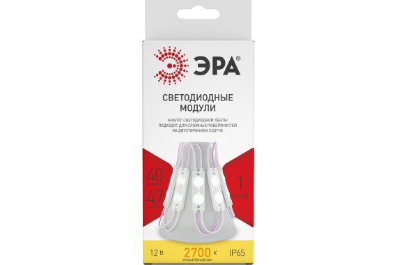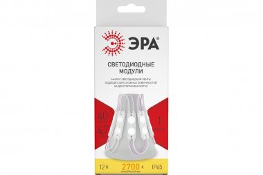 ЭРА LED модули MZ2835-02-12V-2835-IP65-5m-2700 (50/1500) Светодиодные LED-модули - более универсальный аналог светодиодным лентам. В отличие от лент, их можно наклеивать под любыми углами на любую поверхность и свободно менять направление монтажа между каждым модулем.Цепочку LED-модулей можно обрезать после любого модуля без нарушения его работы по оставшейся длине.Это современный способ создания внутреннего освещения, подсветки ниш, лестничного пространства, систем хранения, а так же декоративного и художественного оформления любых объектов и любых форм.Легко и быстро устанавливается на любой гладкой поверхности с помощью скотча, расположенного на оборотной стороне модулей.Светодиодные модули закрытого типа в герметичном корпусе из ABS пластика с линзами и платой-радиатором.В упаковке находится 4,7 метровая лента из 40 модулей, на каждом модуле расположено по 2 светодиода с цветовой температурой 2700 К. Степень защиты модулей: IP65 применение внутри и снаружи помещений.