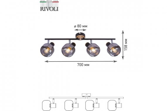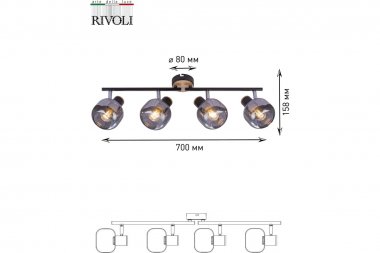 Светильник настенно-потолочный спот Rivoli Dorkas 7026-704 4 х E14 40 Вт поворотный Броский дизайн этих светильников достигается сочетанием контрастных оттенков затемнённых выдувных плафонов и тёмного металлического каркаса с декоративными элементами из светлого дерева. Споты оснащены долговечными поворотными механизмами высокого качества с надёжной фиксацией. Коллекция представлена настенно-потолочным светильником на 4 лампы.