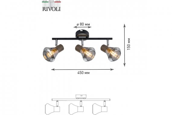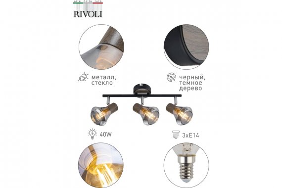 Светильник настенно-потолочный спот Rivoli Eho 7031-703 3 х E14 40 Вт поворотный Чёрный цвет арматуры этих стильных спотов вручную патинирован серебром. Получив такую оригинальную текстуру корпуса, светильники Rivoli Eho стали идеальным решением для интерьеров в стиле лофт, минимализм, модерн, эклектика. Оснащены долговечным поворотным механизмом высокого качества с надёжной фиксацией, что позволяет с успехом использовать споты в гардеробных, мастерских, кладовых, прихожих, коридорах. Функциональное и красивое освещение в квартиру, студию, кафе, общественное пространство. Коллекция представлена спотом на 3 лампы.