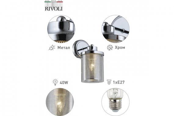 Бра светильник Rivoli Adriana 4058-401 настенный 1 х E27 40 Вт дизайн Дизайнерское бра Adriana Rivoli в стиле лофт. Двойной плафон из перфорированного металла и прозрачного стекла выглядит оригинально. Металл и стекло прекрасно дополняют друг друга, чтобы данное бра настенное могло создать уют в вашем доме. Хромированное бра Adriana лаконично смотрится на стене, это прекрасный вариант бра над кроватью, бра на кухню, бра над столом, бра в прихожую, бра у туалетного столика. Настенные светильники Rivoli Adriana созданы европейскими дизайнерами как универсальное решение для преображения интерьера. Бра применяется с лампой Е27 40 Вт. Rivoli Adriana - коллекция итальянского бренда Rivoli, в которую входят люстры подвесные под 3, 5 и 8 ламп, а также настенный светильник под 1 лампу. Артикулы, чтобы посмотреть фото коллекции, заказать люстры и бра: 4058-203, 4058-205, 4058-208, 4058-401. Коллекцию Adriana часто выбирают для сегмента horeca - вы можете купить такие люстры и бра в гостиницу, отель, ресторан, кафе, общественное пространство.
