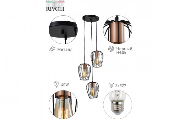 Светильник подвесной (подвес) Rivoli Atena 5063-203 3 х E27 40 Вт лофт - кантри Подвесной светильник Atena Rivoli (арт. 5063-203) имеет три эффектных чёрных плафона, оформленных металлическими прутьями. Патрон модного цвета меди подчёркивает красоту источника света. Потолочные подвесные светильники Atena отличный вариант для стилей лофт, минимализм, ретро, скандинавский. Основание и арматура Rivoli Atena изготовлены из металла со стойким гальваническим покрытием. Такие подвесные светильники на тросах с течением времени будут выглядеть как новые. Плафоны в форме бутонов придают подвесному светильнику вид элегантной люстры.Подвесные светильники Atena стоит купить для кухни, гостиной, квартиры-студии, загородного дома. Их применяют для создания стильного интерьера в кафе, ресторанах, барах, гостиницах. Такие подвесные светильники размещают над столом, барной стойкой, в зоне отдыха. Площадь освещения 10 м?.Atena применяется с лампами Е27 мощностью 40 Вт обычными или экономичными светодиодными. С подвесом идеально сочетаются филаментные лампы под старину. Длина тросов регулируется. Серия дополнена светильником с 1 плафоном (арт. 5063-201) и люстрой на 5 ламп (арт. 5063-205).