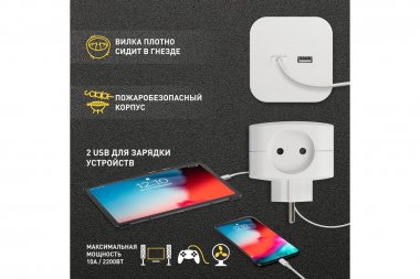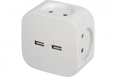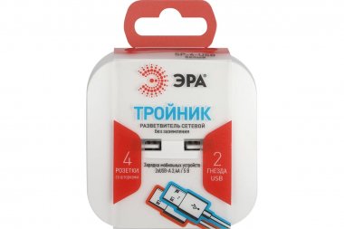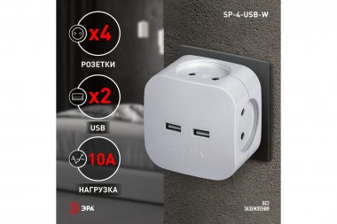 Разветвитель электрический ЭРА SP-4-USB-W на 4 розетки 220V + 2xUSB 2400mA, без заземл 10А (белый) Тройник (адаптер) ЭРА с 4-мя розетками и 2-мя USB гнездами для зарядки портативных устройств. Новые тройники с USB собственного дизайна ЭРА отличаются эргономичным конструктивом и удобством в использовании. Идеален для зарядки мобильных телефонов и планшетов. Незаменим с собой в дороге. Особенно актуален, когда в помещении мало источников подключения - можно из одной розетки сделать четыре и при этом ещё заряжать 2 устройства одновременно через USB. Максимальная мощность USB разъемов: 2400 мА. Разветвитель сетевой в форме кубика с закруглёнными углами выглядит оригинально и отличается компактностью. Розетки утоплены в корпус, благодаря чему вилка плотно сидит в гнезде. Под USB-портами - объёмный логотип ЭРА. Разветвитель-кубик ЭРА в белом цвете - арт. Б0049532, в чёрном цвете - Б0049536.