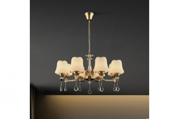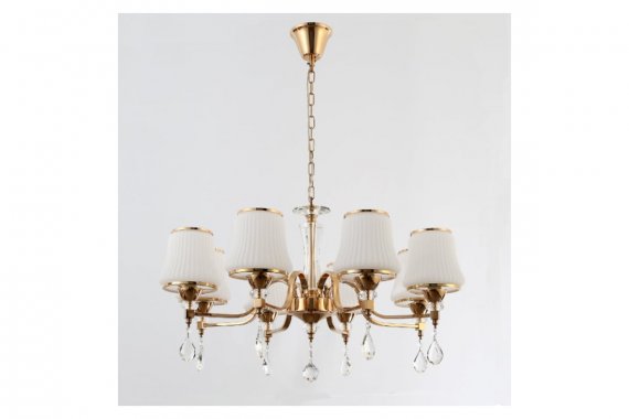Люстра Rivoli Herta 2006-208 8 * Е14 40 Вт классика Люстры потолочные Rivoli Herta стоит купить людям, которые ценят комфорт и ищут светотехнику с оптимальным сочетанием цены и качества. Выполненные в классическом стиле, эти большие 8-рожковые люстры имеют множество "изюминок", придающих им самобытность. Вам понравятся необычные линии арматуры, рельефные стеклянные плафоны, декорирование хрустальными элементами.Металлический корпус люстр на потолок Herta окрашен в необычный цвет французское золото этот тёплый оттенок настраивает на позитивный лад. Благодаря матовым плафонам люстры Herta станут хорошим решением для спальни свет будет мягким и равномерным, без бликов, приятным для отдыха и подготовки ко сну. Подвесные люстры Rivoli Herta в гостиной, столовой или загородном доме актуальны благодаря большой освещаемой площади 24 м?. Применяйте их с лампами Е14 мощностью 40 Вт обычными или светодиодными.Важное преимущество люстр Herta - регулировка подвеса. Можно организовать качественное освещение в комнате с любой высотой потолка и решить сложные дизайнерские задачи. Серия Herta от итальянского бренда Rivoli - это люстра на 8 ламп (арт. 2006-208), на 5 ламп (арт. 2006-205) и бра (арт. 2006-401).