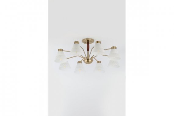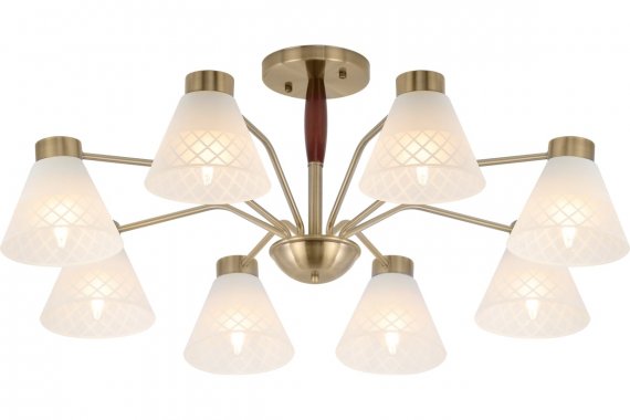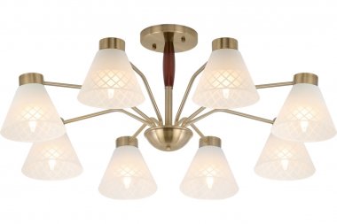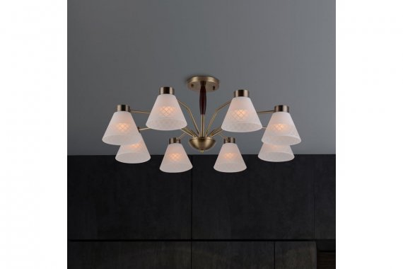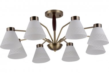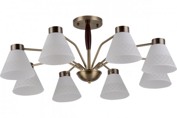 Люстра Rivoli Meta 2058-308 8 х Е27 40 Вт классика Подвесные люстры Rivoli Meta олицетворяют собой современный взгляд на классику. Металлический корпус с простыми чёткими линиями рожков имеет стойкое покрытие оттенка античная бронза. Плафоны из матового стекла декорированы геометричным узором. Основание этой большой 8-рожковой люстры украшено темно-коричневым деревянным элементом, придающим данной люстре на потолок оригинальность и солидность.Современные люстры Meta от итальянского бренда Rivoli гармонично сочетают в себе традиционную элегантность и актуальный минимализм. За счет этого они идеально подойдут для самых разных пространств от классических до лофт-интерьеров.Люстра с эргономичным круговым расположением ламп беспроигрышное решение для гостиной, столовой, кухни, спальни, квартиры-студии, загородного дома. К Rivoli Meta подходят лампы самого популярного цоколя Е27. Мощность каждого источника света 40 Вт. Данные подвесные люстры ярко и качественно освещают большие комнаты площадью 24 м?. Для экономии электроэнергии применяйте светодиодные лампы. Серия Rivoli Meta это люстры с 5 лампами (арт. 2058-305) и с 8 лампами (арт. 2058-308).