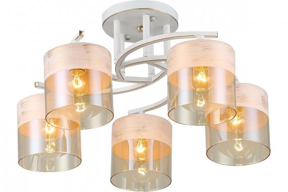 Люстра Rivoli Constancia 9081-305 5 * Е27 40 Вт модерн Rivoli Constancia (арт. 9081-305) - аккуратная светлая люстра в гостиную. Выполнена в стиле модерн, однако отлично подходит для интерьеров в скандинавском стиле, в стилях прованс, кантри. Металлический корпус люстры имеет красивое окрашивание в белом и золотом цветах. Техника декоративного состаривания создает в доме уютное спокойное настроение. Люстры потолочные Conctancia от итальянских дизайнеров изготовлены из качественных и прочных материалов. Стеклянные плафоны мягко тонированы в золотистый оттенок и приятно рассеивают свет. Такие люстры не только украшают ваш потолок, но и формируют комфортное для глаз освещение. Приятный дизайнерский бонус белый ободок в верхней части каждого плафона.Освещаемая площадь этой люстры с 5 плафонами - 15 м?. Подходят лампы Е27 40 Вт, в том числе экономичные светодиодные аналоги. Размер люстры - 500*500*260 мм. Вы оцените ее доступную цену и стильный внешний вид. Коллекция расширена люстрой под 3 лампы - арт. 9081-303.
