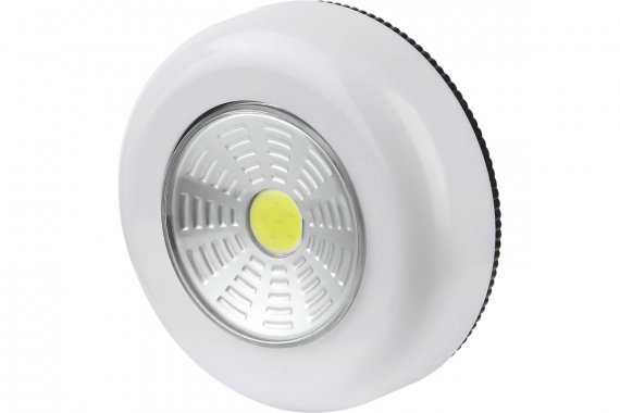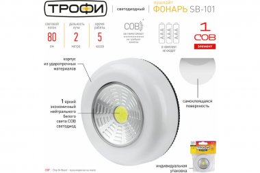 Светодиодный фонарь подсветка Трофи SB-101 пушлайт [СОВ, 3хААА, белый, 1шт в пак.] Компактный фонарь-пушлайт Трофи SB-101 отличный вариант бытовой подсветки. Монтируется на поверхность за считанные секунды удалить защитный слой с обратной стороны корпуса и приклеить. Помогает быстро и без проблем организовать дополнительную подсветку в затемненных местах дома или дачи в шкафу, подсобных помещениях, на стеллажах, полках, в ванной комнате, кладовой, коридоре, над рабочими столешницами кухни.Включается и выключается легким нажатием на корпус. Работает от 3 мизинчиковых батареек ААА. Одного комплекта алкалиновых элементов питания хватит на 5 часов непрерывной подсветки. Светит ярко благодаря современному COB-светодиоду. Источник света не перегорает и не тускнеет со временем.За счет эргономичной круглой формы, малого веса и базового белого цвета корпуса фонарик прекрасно смотрится в любом интерьере.