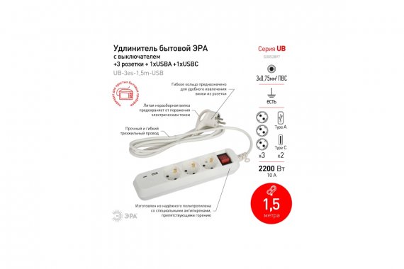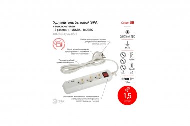 Удлинитель электрический ЭРА UB-3es-1,5m-USB c заземлением с выключателем 3 розетки + 1xUSBA+1xUSBC 1,5м 10А Удлинитель электрический ЭРА UB-3es-1,5m-USB с заземлением, с выключателем, 3 розетки, 1,5м ПВС 3x0,75мм2. Рассчитан на максимальную мощность 10А/2200Вт. 2-мя USB гнездами (Type A и Type C) для зарядки портативных устройств. Максимальная мощность USB разъемов: 2400 мА. Новые удлинители ЭРА с USB разработаны и произведены в России. Удобная кнопка включения позволяет отключать электроприборы, не выдёргивая вилку удлинителя из сети. Для комфортного извлечения вилка удлинителя имеет гибкое кольцо. Глубокие гнёзда удлинителей ЭРА с USB-портами надёжно фиксируют вилки электроприборов. Прочный и гибкий трёхжильный провод - залог электробезопасности и долговечности данных приборов. Разветвители и удлинители ЭРА с USB изготовлены из пожаробезопасных материалов, в составе которых присутствуют препятствующие горению антипирены. Корпусы ударопрочны. Доступен выбор длины шнура - 1,5, 3 или 5 метров. Удлинители ЭРА с 2 USB-портами и 3 розетками: арт. Б0052897 - со шнуром 1,5 м; арт. Б0052898 - со шнуром 3 м; арт. Б0052899 - со шнуром 5 м. Удлинители ЭРА с 3 розетками + 1 порт USB Type A + 1 порт USB Type C: арт. Б0052900 - со шнуром 1,5 м; арт. Б0052901 - со шнуром 3 м; арт. Б0052902 - со шнуром 5 м.