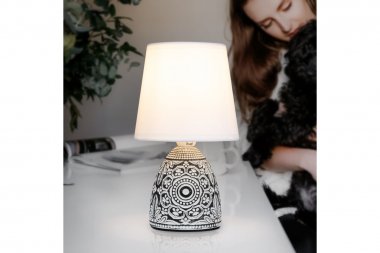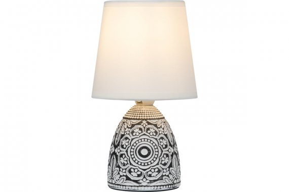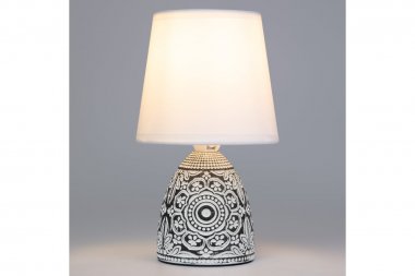 Настольная лампа Rivoli Debora 7045-502 1 * Е14 40 Вт керамика черная с абажуром Rivoli Debora (арт. 7045-502) - интерьерный настольный светильник с белым тканевым абажуром и черным керамическим основанием с узорами. Дизайн создан в Италии в соответствии с современными тенденциями оформления интерьеров. Настольная лампа Debora от итальянского бренда Rivoli изготовлена в актуальном экостиле. Керамическое основание имеет эффектный узорчатый рисунок, в котором угадывается восточная стилистика. Базовый цвет с легкостью впишет этот дизайнерский настольный светильник в любой интерьер. Настольные лампы Debora хороши для стилей классика, винтаж, восток, модерн, ретро. Важное преимущество, отличающее данные лампы настольные - натуральные материалы. Лампа настольная Debora с удобным выключателем на проводе является переносной. Легко переставлять из комнаты в комнату, выбирать для светильника самое удачное место в помещении - без демонтажа и за считанные секунды. Для работы настольной лампы нужно только вкрутить лампочку Е14 40 Вт и вставить вилку в сеть. Подходят экономичные светодиодные источники света. Коллекция Rivoli Debora дополнена настольными лампами в бело-зеленом цвете (арт. 7045-501), в бело-коричневом (арт. D 7045-501) и бело-синем (арт. D 7045-502).