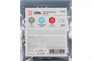 Светодиодная лента ЭРА LS2835 9,6-120-12-4000K-IP20-1 year белая 5м Светодиодная лента LS2835-9,6-120-12-4000K-IP20-1 year-5m со степенью защиты от пыли и влаги IP20 - современный способ создания внутреннего освещения, подсветки ниш, лестничного пространства, систем хранения, а также декоративного и художественного оформления любых объектов и форм. Легко и быстро устанавливается на любой гладкой поверхности с помощью скотча, расположенного на оборотной стороне ленты. Используя алюминиевый профиль, можно создавать необычные и функциональные решения освещения в Вашем интерьере. Рабочее напряжение ленты составляет 12 В, а мощность равна 9,6 Вт/м. Светодиодная лента обладает световым потоком 840 лм/м с дневным белым цветом свечения (4000К). ВНИМАНИЕ: - светодиодную ленту с напряжением 12В допустимо подключать последовательно отрезками не более 5 м. - для светодиодных лент с мощностью выше 9.6 Вт обязательно использование алюминиевого профиля для дополнительного охлаждения. Это существенно продлит срок службы светодиодной ленты. - во избежание выхода из строя не допускается длительная работа ленты в смотанном виде.