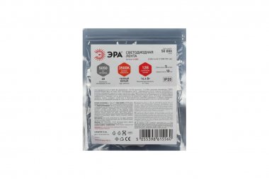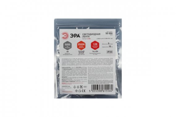 Светодиодная лента ЭРА LS5050 14,4-60-12-4000K-IP20-1 year-5m нейтральный белый свет Светодиодная лента LS5050-14,4-60-12-4000K-IP20-1 year-5m со степенью защиты от пыли и влаги IP20 - современный способ создания внутреннего освещения, подсветки ниш, лестничного пространства, систем хранения, а также декоративного и художественного оформления любых объектов и форм. Легко и быстро устанавливается на любой гладкой поверхности с помощью скотча, расположенного на оборотной стороне ленты. Используя алюминиевый профиль, можно создавать необычные и функциональные решения освещения в Вашем интерьере. Рабочее напряжение ленты составляет 12 В, а мощность равна 14,4 Вт/м. Светодиодная лента обладает световым потоком 750 лм/м с дневным белым цветом свечения (4000К). ВНИМАНИЕ: - светодиодную ленту с напряжением 12В допустимо подключать последовательно отрезками не более 5 м. - для светодиодных лент с мощностью выше 9.6 Вт обязательно использование алюминиевого профиля для дополнительного охлаждения. Это существенно продлит срок службы светодиодной ленты. - во избежание выхода из строя не допускается длительная работа ленты в смотанном виде.