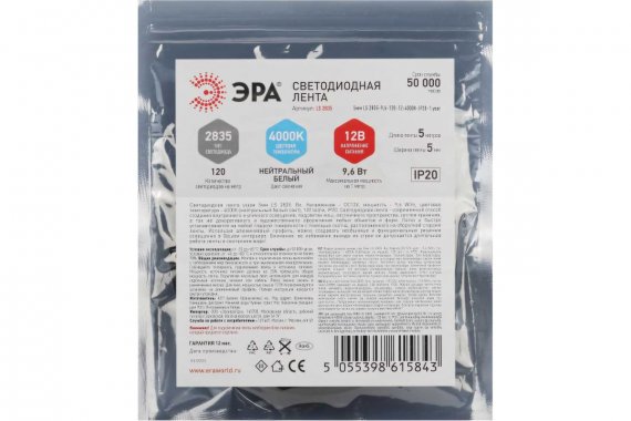 Технические характеристики ЭРА узкая 5мм LS2835 9,6120124000KIP201 year5m нейтральный белый свет Б0053980