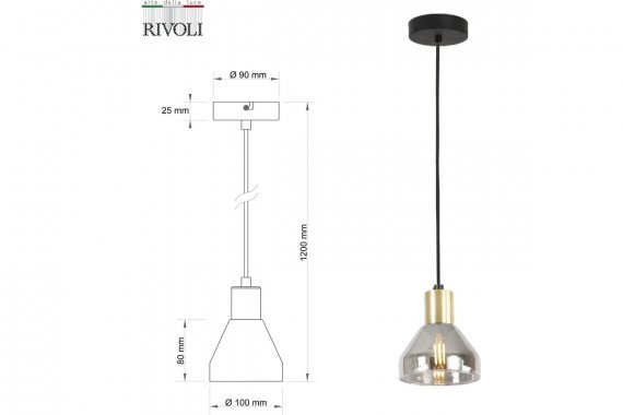 Светильник подвесной (подвес) Rivoli Kassandra 3118-201 1 х Е14 40 Вт модерн потолочный Rivoli Kassandra - дизайнерский светильник подвесной из металла и стекла. Диаметр плафона - 100 мм. Высота регулируется при монтаже. Стеклянный дымчатый плафон эффектно выглядит и смягчает световые блики. Основание светильника - черное, а плафон имеет декоративный патрон цвета "латунь". Подвесной светильник создан в соответствии с актуальными тенденциями дизайна интерьеров. Сочетание черного цвета и латуни находится на пике популярности. Подвесной светильник-люстра Kassandra под 1 лампу Е14 40 Вт освещает площадь до 3 м?. Используется в качестве дополнительного освещения и зонирования пространства. Подвесные светильники Rivoli Kassandra на тросах составляют коллекцию из моделей с разным количеством плафонов: арт. 3118-201 - 1 плафон; арт. 3118-203 - 3 плафона разной высоты, арт. 3118-303 - 3 плафона одной высоты. Коллекция создана итальянскими дизайнерами. Подвесные светильники Kassandra часто выбирают, чтобы разместить над столом - они отлично подсвечивают столешницу.