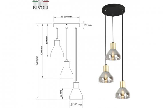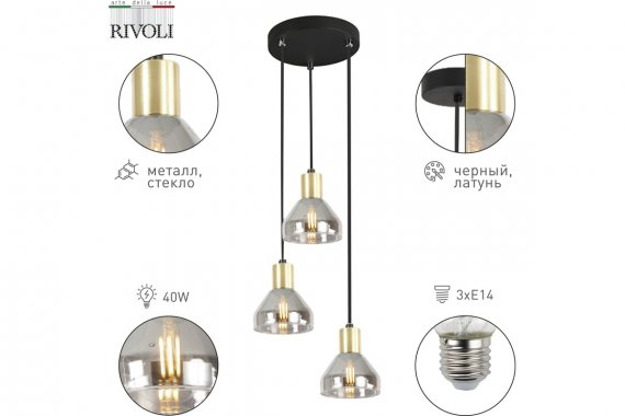 Светильник подвесной (подвес) Rivoli Kassandra 3118-203 3 х Е14 40 Вт модерн потолочный Светильники потолочные подвесные Kassandra от итальянского бренда Rivoli созданы в стиле модерн. Такие подвесные светильники стоит купить для классической или современной кухни, гостиной, спальни. Вполне подходят такие светильники подвесные и для популярного стиля лофт. Подвесные светильники Kassandra часто выбирают, чтобы разместить над столом - они отлично подсвечивают столешницу. Подвесные светильники Rivoli Kassandra на тросах составляют коллекцию из моделей с разным количеством плафонов: арт. 3118-201 - 1 плафон; арт. 3118-203 - 3 плафона разной высоты, арт. 3118-303 - 3 плафона одной высоты. Сочетание черного матового, латунного и дымчатого оттенков выглядит превосходно. Данный светильник подвесной с 3 дымчатыми стеклянными плафонами - дизайнерское решение для зонирования пространства или организации дополнительного освещения. Плафоны расположены на разных уровнях, что придаст вашему интерьеру изюминку. Высоту каждого плафона можно отрегулировать при монтаже светильника.