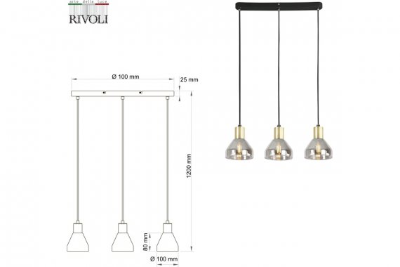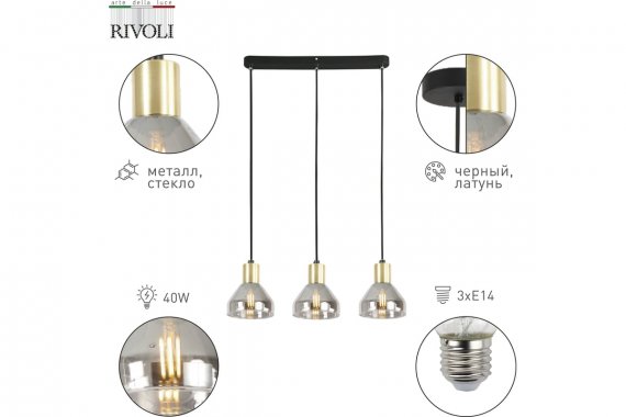 Светильник подвесной (подвес) Rivoli Kassandra 3118-303 3 х Е14 40 Вт модерн потолочный Rivoli Kassandra - подвесной светильник с 3 плафонами из дымчатого стекла. Подвесные светильники на тросах Rivoli Kassandra дают возможность отрегулировать высоту подвесов при установке светильника на потолок. Коллекция Kassandra - дизайнерская, создана в Италии. Стиль коллекции - модерн - одно из самых популярных решений для современных интерьеров. Впишутся такие светильники потолочные подвесные и в актуальный стиль лофт. Если вы выбираете классику - подвесные светильники Kassandra также подойдут для вашей кухни, гостиной или спальни. Рекомендуемые лампы в подвесной светильник-люстру Kassandra - Е14 40 Вт. Освещаемая площадь - до 9 м?. Стоит купить этот стильный лаконичный светильник подвесной для зонирования пространства или дополнительного освещения. Подвесные светильники Rivoli Kassandra на тросах составляют коллекцию из моделей с разным количеством плафонов: арт. 3118-201 - 1 плафон; арт. 3118-203 - 3 плафона разной высоты, арт. 3118-303 - 3 плафона одной высоты.