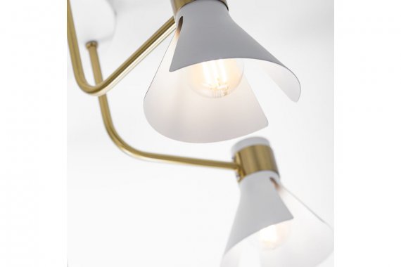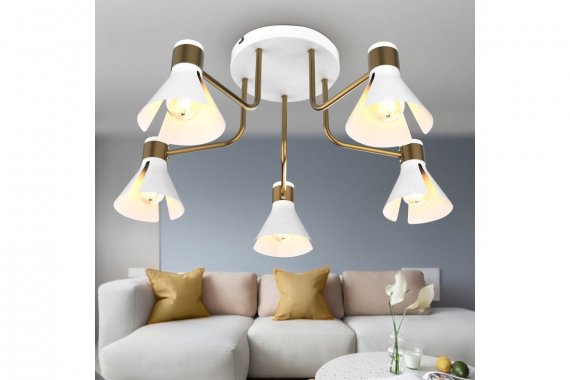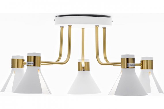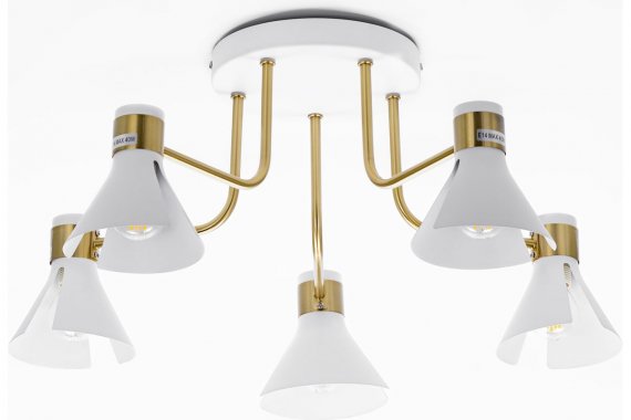Люстра Rivoli Maira 7054-735 5 х Е14 40 Вт Дизайнерская коллекция Maira от итальянского бренда Rivoli – это светильник настенный поворотный (арт. 7054-701) и потолочная люстра с 5 плафонами (арт. 7054-735). Прочные люстры и светильники из металла имеют современный элегантный дизайн в сочетании белого цвета и цвета античное золото. Применено гальваническое окрашивание, надолго сохраняющее целостность и оттенок покрытия. Люстра Rivoli Maira освещает площадь до 15 м2. Металлические рожки люстры эффектно изогнуты, равномерно распределяя свет. Для данной люстры подходят лампы с цоколем Е14, в том числе светодиодные. Трапециевидные плафоны в форме полуоткрытых колокольчиков направляют световой поток вниз. Эта люстра потолочная привнесёт в ваш дом много света и красоты!