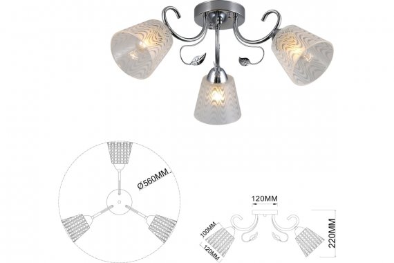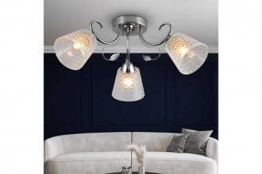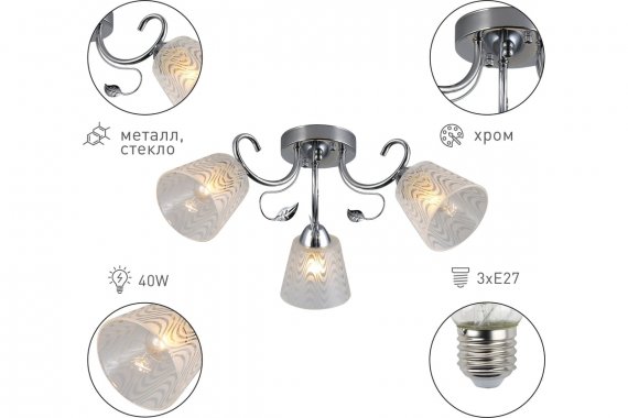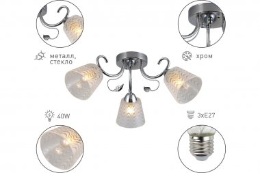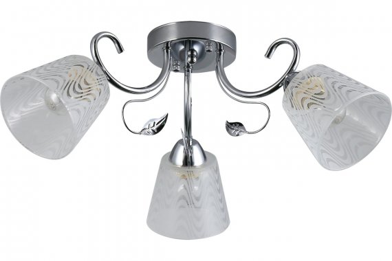 Люстра Rivoli Nelma 3187-303 3 х Е27 40 Вт модерн Rivoli Nelma – коллекция люстр и светильников итальянского дизайна. Качественная арматура окрашена в актуальный оттенок хром. Полупрозрачные плафоны декорированы волнообразными матовыми вставками. Корпус украшен металлическими веточками с листочком. Флористический дизайн коллекции отлично подходит для классического или восточного стилей, стилей модерн, современная классика, эклектика. Rivoli Nelma – это люстра 3-рожковая (арт. 3187-303), люстра 5-рожковая (арт. 3187-305), бра (арт. 3187-401). Данная люстра применяется с 3 лампами Е27 40 Вт. 3-рожковые люстры Nelma подходят для небольших жилых комнат, качественно освещают площадь 9 кв м. Люстры потолочные Nelma Rivoli идеальны в гостиную, спальню, детскую, загородный дом. Создают лёгкое воздушное настроение, делают помещение светлее и визуально больше.