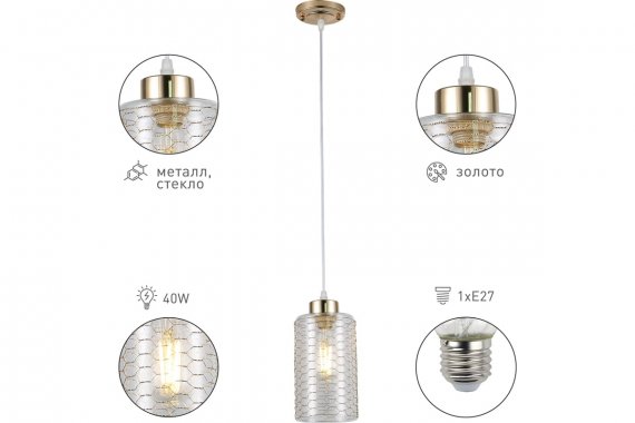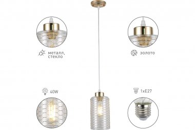 Светильник подвесной (подвес) Rivoli Malice 9124-201 1 х Е27 40 Вт модерн потолочный Rivoli Malice (арт. 9124-201) - светильники потолочные подвесные с красивым прозрачным плафоном и эффектным золотым декорированием. При монтаже высоту подвеса Malice от итальянского бренда Rivoli можно отрегулировать. Подвесной светильник выполнен в популярном стиле модерн и станет удачной деталью любого интерьера. Подвесные светильники Malice хороши для кухни, купить такие подвесные светильники можно для размещения над столом, в зоне отдыха, над кухонным островом, рабочей столешницей или барной стойкой. Подвесные светильники на тросах в современных дизайн-проектах часто применяют в прихожей, в спальне или гостиной для зонирования пространства. Подвесной светильник-люстра Rivoli Malice имеет аккуратный плафон-стаканчик с золотистым узором в виде пчелиных сот. Заказать такой подвес - значит создать в доме неповторимый стиль и уютную атмосферу. Европейская коллекция Malice дополнена подвесным светильником с 3 плафонами - арт. 9124-203.