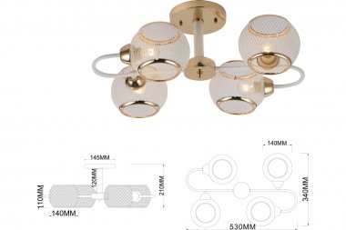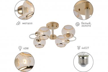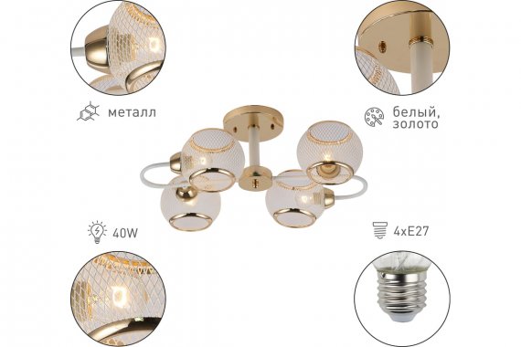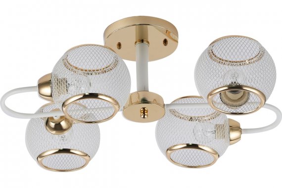 Люстра Rivoli Mortifera 3130-304 4 х Е27 40 Вт модерн Rivoli Mortifera - коллекция стильных итальянских люстр на невысокий потолок или потолок средней высоты. Дизайнерские люстры Mortifera изготовлены из легкого прочного металла со стойким гальваническим окрашиваем в белый и золотой цвета. Металлические сетчатые плафоны круглой формы обрамлены красивыми золотыми ободками. Основной цвет люстры - белый. Люстры потолочные Mortifera светлые, визуально невесомые, аккуратные. Создают в помещении легкую уютную атмосферу. Такие люстры хороши в гостиную в скандинавском стиле, стоит купить эти люстры в минималистичную спальню, подойдут данные люстры на кухню в светлых тонах. Металл - надежный и долговечный материал для люстры. К тому же металлические современные люстры выглядят очень актуально, привносят в интерьер изюминку и делают пространство гармоничным, продуманным. Европейская коллекция Rivoli Mortifera - это люстры потолочные под 4, 6 и 8 ламп (арт. 3130-304, 3130-306, 3130-308). Данная люстра с 4 плафонами освещает площадь 15 м2.