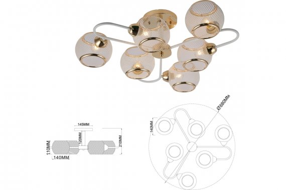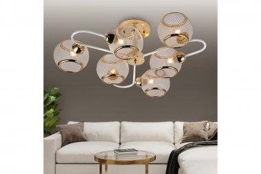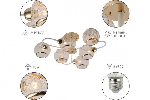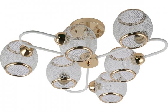 Люстра Rivoli Mortifera 3130-306 6 х Е27 40 Вт модерн Бело-золотые люстры из металла Rivoli Mortifera. Данная люстра в гостиную (арт. 3130-306) имеет 6 металлических сетчатых плафонов под лампы Е27 (рекомендованная мощность - 40 Вт). Коллекция современных люстр Mortifera от итальянского бренда Rivoli отличается прочностью и визуальной легкостью. Люстры Mortifera превосходно смотрятся на потолке, привлекают внимание оригинальными рожками и стильными круглыми плафонами с решетчатым каркасом. Базовый белый цвет арматуры и плафонов люстры в спальню Mortifera Rivoli гармонично дополняется деталями золотого цвета. Если нужна люстра на кухню или люстра на потолок жилой комнаты, Rivoli Mortifera для вас! Эта современная люстра под 6 ламп хорошо освещает площадь 18 м2. Металл гальванизирован - это значит, что люстра сохранит свой красивый внешний вид надолго, не будет царапин и сколов, белый цвет не пожелтеет, а золотой не потускнеет. В коллекцию Mortifera входят люстры потолочные с 4 плафонами (арт. 3130-304) и люстры с 8 плафонами (арт. 3130-308).