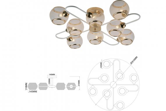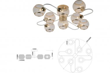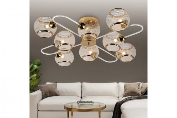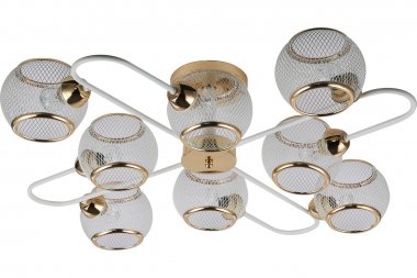 Люстра Rivoli Mortifera 3130-308 8 х Е27 40 Вт модерн Металлические люстры Rivoli Mortifera белого цвета с золотистыми элементами. Итальянская коллекция современных люстр для доступного и быстрого преображения интерьера. В числе "фишек" коллекции - сетчатые круглые плафоны на оригинально расположенных и креативно изогнутых рожках. Базовый белый цвет, в который окрашены люстры потолочные Mortifera, универсален для большинства интерьеров. Люстры в гостиную Mortifera выполнены в стиле модерн, при этом станут отличным вариантом основного освещения в комнаты скандинавского стиля, стилей минимализм, лофт, ретро, кантри, индастриал. Люстры из металла с решетчатыми плафонами - один из главных трендов современного дизайна пространств. Данная люстра в спальню, люстра на кухню (арт. 3130-308) способна качественно осветить большую площадь - 24 м2. Восемь металлических плафонов под 8 ламп Е27 40 Вт оптимально распределяют свет. В коллекции Mortifera есть также люстры с 4 плафонами (арт. 3130-304) и люстры с 6 плафонами (арт. 3130-306).