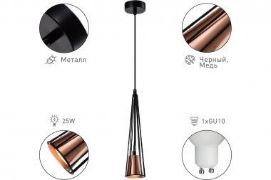 Светильник подвесной (подвес) Rivoli Emily 4160-201 1 х GU10 25 Вт дизайн потолочный Дизайнерские потолочные светильники на тросах Rivoli Emily под 1 лампу GU10 25 Вт - арт. 4160-201. Высоту троса можно отрегулировать при монтаже подвесного светильника-люстры. Подвесной светильник Emily создан итальянским брендом Rivoli в трендовом сочетании черного и медного цветов. Компактный плафон оттенка меди "спрятан" в реечный металлический конус. Основание подвесного светильника над столом изготовлено из качественного металла, трос отличается высокой прочностью. Подвесные светильники Emily Rivoli для кухни прослужат долго и не потеряют свой превосходный внешний вид благодаря стойкому гальваническому покрытию металлической арматуры и металлического плафона. Европейский бренд Rivoli предлагает аналогичный светильник подвесной в цвете латунь - арт. 4159-201. Светильники потолочные подвесные - беспроигрышное решение для современного интерьера. Подвесные светильники на тросах помогают разделить пространство на функциональные зоны, внести в интерьер красоту и оригинальность.