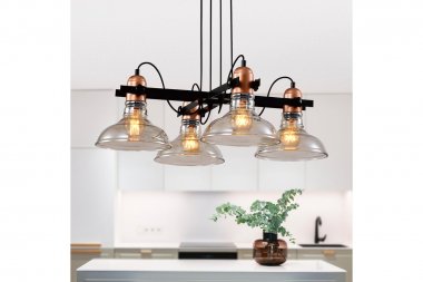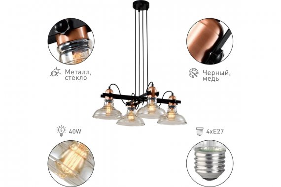 Люстра Rivoli Leila 4093-304 4 х Е27 40 Вт дизайн Rivoli Leila (арт. 4093-304) - подвесные люстры с 4 прозрачными плафонами в стиле лофт. Подходят для стилей кантри, ретро, индастриал. Люстры Leila созданы итальянскими дизайнерами бренда Rivoli, заказать их в России можно по доступной цене. Эти стильные люстры, отвечающие самым актуальным трендам дизайна интерьеров, помогут преобразить квартиру, студию, загородный дом. Люстра Leila подходит на высокий потолок или потолок средней высоты. Дизайн люстры дает отсылку к уличным ретрофонарям. Плафоны из качественного закаленного стекла тонированы в мягкий теплый оттенок, что делает свет от люстры более уютным. 4 дизайнерских плафона расположены на перекрестных металлических рейках. Люстры потолочные Leila Rivoli выглядят эффектно с любой стороны - сбоку, снизу. Удачное решение - разместить такие люстры над столом. В то же время подвесные светильники Leila подходят и в качестве основной люстры в комнате, освещая 12 м2. В коллекции есть люстры на тросах под 1 и 3 лампы (арт. 4093-201, 4093-203).