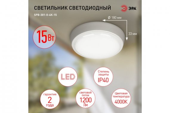 Светильник ЖКХ светодиодный ЭРА SPB-301-0-4K-15 IP40 15Вт 1200Лм 4000K 180х180х33 круг накладной Универсальный пылевлагозащищённый LED-светильник для освещения помещений с повышенной влажностью, лестничных клеток, балконов, подвалов, технических и подсобных помещений. А также для бытового использования над крыльцом, на балконе, в подвале, в хозблоке, в гараже.