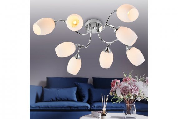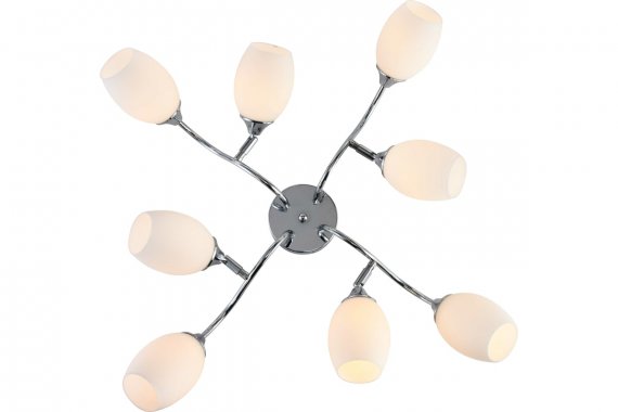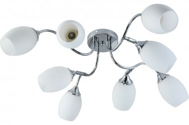 Люстра Rivoli Hollie 3135-308 8 х Е27 60 Вт модерн Rivoli Hollie (арт. 3135-308) - современная 8-рожковая люстра на потолок со стеклянными плафонами в виде бутонов и хромированной арматурой, напоминающей цветочные веточки. Люстры Hollie - элегантная и эффектная коллекция от итальянского бренда Rivoli. Данная люстра в гостиную с 8 плафонами качественно освещает площадь 24 м2. В коллекции Hollie есть также 6-рожковые люстры потолочные, оптимальные для площади 18 м2. Люстры Hollie Rivoli под 8 ламп Е27 60 Вт стоит купить в просторную спальню, в гостиную. Удачно заказать эти люстры на кухню, совмещенную с гостиной, в квартиру-студию, в загородный дом. Стиль, в котором оформлены эти современные люстры потолочные - модерн. Покрытие трендового цвета хром нанесено гальваническим способом, обеспечивающим стойкость люстры к механическим повреждениям и выцветанию. Оригинальные рожки люстры привлекают внимание и преображают пространство. Люстры в стиле модерн - актуальное решение в профессиональных дизайн-проектах.