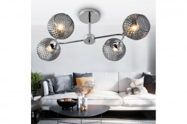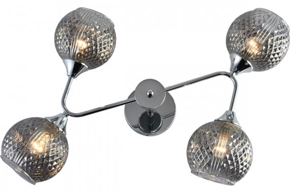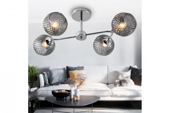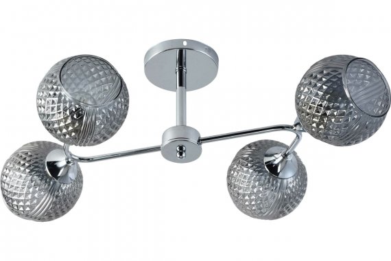 Люстра Rivoli Haley 3137-304 4 х Е27 60 Вт модерн Люстры Haley от итальянского бренда Rivoli выполнены в стильном сочетании серебристо-хромированной арматуры и дымчатых плафонов. В коллекцию Rivoli Haley входят люстры потолочные под 4 лампы (арт. 3137-304) и 6 ламп (арт. 3137-306). Небольшая люстра в гостиную Haley Rivoli с 4 стеклянными плафонами освещает площадь до 12 м2. Такие люстры - оптимальное решение на кухню. Купить люстры Haley стоит в маленькую спальню, в прихожую, коридор. Профессиональные дизайнеры интерьеров выбирают хромированные современные люстры для стилей лофт, индастриал, модерн, минимализм. Металлические люстры со стойким гальваническим покрытием под хром хорошо подойдут на белый потолок, на бетонный, бежевый или серый потолок. Люстры Haley Rivoli совместимы с натяжными, монолитными, гипсокартонными потолками. Эти люстры станут универсальным решением для любого пространства, любого ремонта, любого интерьера. Отличительная особенность люстр коллекции Haley - рожки оригинального изгиба под 2 плафона на каждом.
