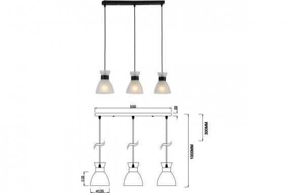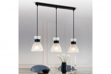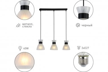 Светильник подвесной (подвес) Rivoli Alma 9158-203 3 х Е27 60 Вт модерн потолочный Светильники потолочные подвесные Alma Rivoli имеют 3 стеклянных плафона-трапеции, расположенных на единой рейке базового черного цвета. Черные тросы подвесных светильников над столом Alma от итальянского бренда Rivoli при монтаже можно отрегулировать по высоте. Плафоны из матового белого стекла с узором в виде аккуратных вертикальных полос контрастно декорированы черным кольцом из металла. Металлическая рейка, объединяющая 3 дизайнерских плафона, отлично подходит для установки на кухне, делая подвесные светильники Alma идеальным решением над столом. Один подвесной светильник Rivoli Alma под 3 лампы Е27 60 Вт хорошо освещает столешницу и подсвечивает площадь до 9 м2. В коллекции Rivoli Alma есть светильник подвесной с 1 плафоном в формате подвесной люстры - арт. 9158-201. Подвесные светильники на 3 тросах Alma Rivoli - практичное решение для квартиры студии. Эти подвесные светильники для кухни, подвесные светильники для гостиной обеспечивают красивое и эффективное зонирование пространства.