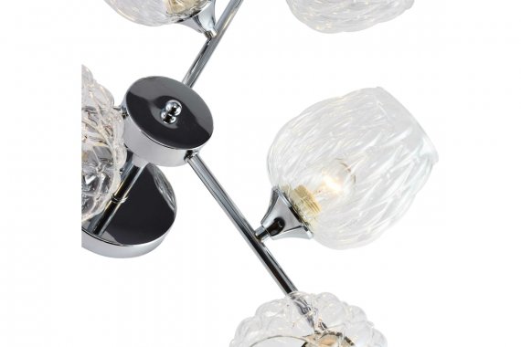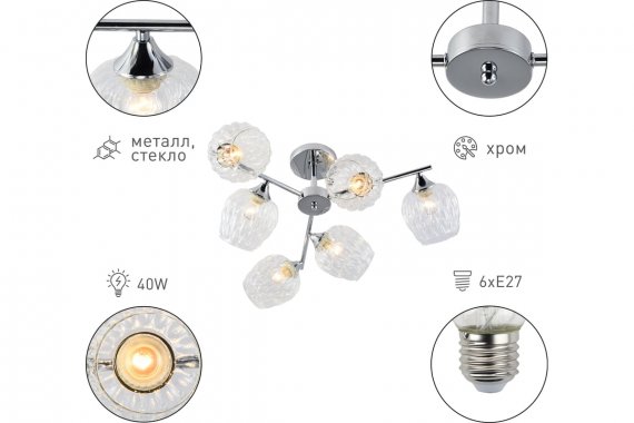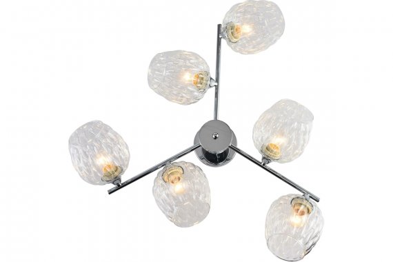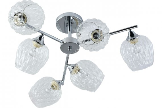 Люстра Rivoli Arlene 3139-306 6 х Е27 60 Вт модерн Люстры потолочные Rivoli Arlene (арт. 3139-306) - это сочетание трендовой хромированной арматуры и прозрачного дизайнерского стекла. Люстры в гостиную Arlene с 6 узорчатыми стеклянными плафонами великолепно пропускают свет, освещая площадь 18 м2. Арматура люстры отличается лаконичностью форм. Стойкое гальваническое покрытие люстры модного оттенка хром делает Arlene Rivoli удачным заказом для современных интерьеров и хорошим вариантом люстры на кухню. Такие люстры прослужат долго, радуя своей красотой и отлично дополняя пространство практически любого стиля. Коллекция итальянских современных люстр Rivoli Arlene дополнена моделью под 4 лампы - арт. 3139-304. Для люстр на невысокий потолок Arlene Rivoli рекомендуем купить лампочки Е27 мощностью 60 Вт. Аккуратные, визуально невесомые люстры Arlene хороши в спальню, в детскую комнату. Эти люстры дают пространству воздуха, легко смотрятся в интерьере. Люстры Arlene выполнены в популярном стиле модерн.