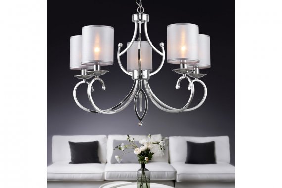 Люстра Rivoli Amy 2063-305 5 х Е14 40 Вт классика Люстра с 5 плафонами (арт. 2063-305), люстра с 8 плафонами (арт. 2063-308) и бра (арт. 2063-401) составляют коллекцию Rivoli Amy в классическом стиле. Дизайнерские подвесные люстры Amy от итальянского бренда Rivoli окрашены в трендовый цвет хром гальваническим способом, сохраняющим насыщенность оттенка на долгие годы и защищающим люстры от царапин и сколов. Подвес люстры декорирован цепочкой, при монтаже люстры на потолок длину подвеса можно отрегулировать. Светлые полупрозрачные плафоны из ткани великолепно пропускают свет, делая освещение в комнате мягким и комфортным для глаз. Освещаемая площадь данной люстры – 15 м2. Рожки с плавными завитками и аккуратный декоративный бутон по центру грамотно создают эстетичный облик классической люстры.