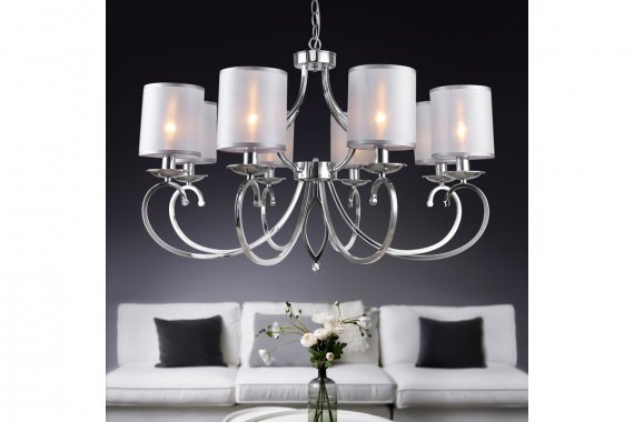 Люстра Rivoli Amy 2063-308 8 х Е14 40 Вт классика Люстра классическая Rivoli Amy (арт. 2063-308) с полупрозрачными тканевыми плафонами под 8 ламп Е14 40 Вт. Данные люстры подвесные входят в классическую коллекцию Amy итальянского бренда Rivoli вместе с бра (арт. 2063-401) и люстрой под 5 ламп (арт. 2063-305). «Фишки» коллекции – плавные линии, закругляющиеся рожки, которые держат плафоны на манер канделябров, декоративная хромированная розетка по центру люстры, аккуратная цепочка подвеса, цилиндрические плафоны из светлой ткани. Лампочки для люстр и бра Rivoli Amy – Е14 мощностью 40 Вт (приобретаются отдельно, можно купить экономичные светодиодные лампы). Подвесные люстры Rivoli Amy хороши тем, что при монтаже люстры на потолок можно отрегулировать длину подвеса, разместив тем самым люстру на нужную высоту.