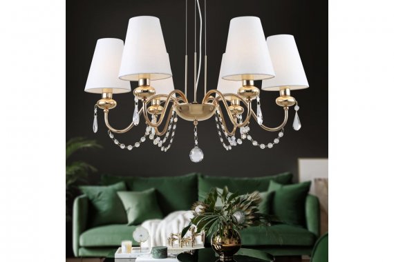 Люстра Rivoli Becky 2066-306 6 х Е14 40 Вт классика Rivoli Becky – классическая коллекция люстр из металла с тканевыми плафонами-абажурами и хрустальными декоративными подвесками. Посмотреть фото всей коллекции: арт. 2066-306 – люстры подвесные классические под 6 ламп, арт. 2066-308 – люстры классические подвесные под 8 ламп, арт. 2066-309 – подвесные люстры классические под 9 ламп, арт. 2066-401 – бра. Данная люстра 6-рожковая, применяется с 6 лампочками Е14 мощностью 60 Вт, освещает площадь до 18 м2. Цвет корпуса люстры – французское золото. Люстра потолочная Rivoli Becky выглядит торжественно и празднично. При этом тканевые традиционные плафоны светлого оттенка гармонизируют помпезность люстры, придавая ей уютный и располагающий к отдыху внешний вид.