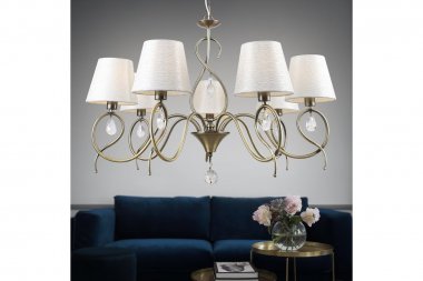 Люстра Rivoli Beatrix 2067-307 7 х Е14 40 Вт классика Rivoli Beatrix – коллекция классических люстр и бра для гостиной, спальни, загородного дома, ресторана, гостиницы. Артикулы для поиска: 2067-305, 2067-307, 2067-401. Коллекция создана итальянскими дизайнерами. Её отличительные особенности: декор в виде хрустальных подвесок, окрашивание металлического корпуса в цвет античной бронзы, рожки в виде завитков с плавными формами, белые тканевые плафоны в формате абажуров. Данная люстра потолочная под 7 ламп Е14 40 Вт освещает площадь до 21 м2. Подвес люстры можно отрегулировать по высоте при монтаже на потолок. Ткань плафонов грязестойкая, не собирает пыль и легко моется. Дизайн элегантных рожков люстры напоминает узелки. Корпус из прочного лёгкого металла.
