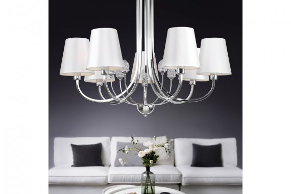 Люстра Rivoli Bet 2068-307 7 х Е14 40 Вт классика Коллекция классических люстр и бра Rivoli Bet декорирована красивыми хрустальными бутонами. Это отличный вариант хрустальной люстры в современный дом. Люстры и бра Bet от итальянских дизайнеров Rivoli подойдут для оформления дизайна ресторана, гостиницы и любого общественного пространства в стиле классика, современная классика. Если вы хотите купить люстру в квартиру, люстру в гостиную, люстру в спальню, люстру в кабинет, люстру в детскую, люстру на кухню, коллекция Rivoli Bet – ваш правильный выбор! Данная металлическая люстра на штанге с 7 белыми тканевыми плафонами (арт. 2068-307) освещает площадь до 21 м2. Коллекцию дополняют люстры потолочные под 5 ламп (арт. 2068-305) и бра (арт. 2068-401). Цвет коллекции – хром. Дизайн минималистичный, современный, без обилия декора. Ткань плафонов легко очищать от пыли в ходе стандартной влажной уборки.