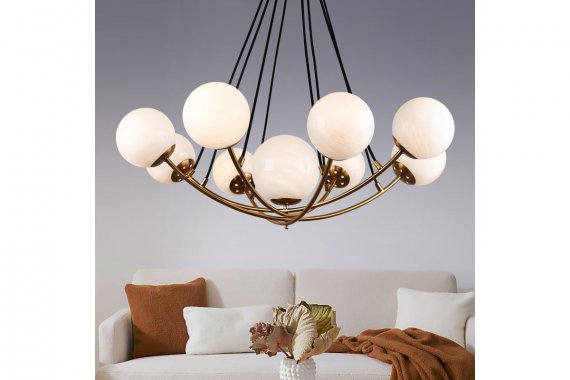 Люстра Rivoli Dina 4099-309 9 х Е14 40 Вт дизайн Большая дизайнерская люстра Rivoli Dina (арт. 4099-309) создаст много света и подойдёт даже для просторных пространств площадью до 30 м2. Круглые плафоны в количестве 9 шт из матового белого стекла отлично рассеивают свет. Корпус люстры окрашен в эффектный цвет латунь и подвешен на тросах. Подвесные люстры – популярное решение для создания стильного современного интерьера. В коллекции итальянского бренда Rivoli есть также люстры подвесные с 7 плафонами (арт. 4099-307) и подвесные люстры с 5 плафонами (арт. 4099-305). Люстры Dina идеально подходят для стилей модерн или современная классика. Часто такие люстры покупают в загородный дом или в гостиную с высокими потолками.