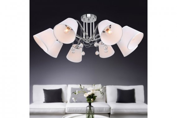 Люстра Rivoli Betsy 2069-308 8 х Е14 40 Вт классика Универсальная классическая люстра Rivoli Betsy, под 8 ламп, с хрустальным декором – арт. 2069-308. Дизайнерские люстры Betsy от итальянского бренда Rivoli – это лаконичный хромированный корпус из лёгкого прочного металла, плафоны из белой абажурной ткани со свойствами защиты от грязи и пыли, подвески из прозрачного хрусталя на миниатюрных декоративных цепочках. Люстры потолочные коллекции Rivoli Betsy применяются с лампочками Е14 40 Вт, для них можно купить экономичные светодиодные источники света. Потолочные люстры на штанге – современный вариант основного освещения в кабинет, в гостиную, на кухню, в спальню, в детскую комнату, в загородный дом.