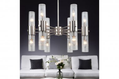 Люстра Rivoli Delia 3146-312 12 х Е14 40 Вт модерн В коллекции Rivoli Delia вы найдёте большие потолочные люстры на штанге: под 12 ламп (арт. 3146-312), под 16 ламп (арт. 3146-316). Отличительная особенность дизайнерской коллекции Delia – цилиндрические двухчастные плафоны из прозрачного стекла. Каждый плафон – под 2 лампочки. Рекомендуем купить для такой люстры источники света в колбе «свеча». Цвет металлического корпуса люстры – никель сатин. Имеется гальваническое покрытие для защиты неповторимого оттенка окрашивания люстры. Люстра современная с 12 лампами качественно осветит пространство площадью до 36 м2. Коллекцию дополняют подвесные светильники Rivoli Delia (арт. 3146-201) и бра Rivoli Delia (арт. 3146-402).