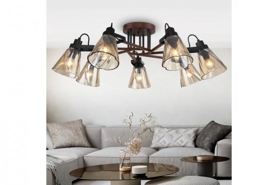 Люстра Rivoli Clarissa 5098-307 7 х Е14 40 Вт лофт - кантри Rivoli Clarissa (арт. 5098-307) – большая потолочная люстра в стиле лофт-кантри. Освещаемая площадь этой люстры на потолок с 7 стеклянными плафонами – до 21 м2. Люстры потолочные Clarissa европейского дизайна хорошо подойдут в гостиную, на кухню, в кабинет, в загородный дом. Такие потолочные люстры создадут уют и помогут качественно осветить даже просторную комнату. В дизайнерской коллекции Clarissa вы найдёте также люстры под 5 ламп (арт. 5098-305) и настенное бра (арт. 5098-401). Все они выполнены в красивом сочетании чёрного цвета и цвета тёмного дерева. Коллекция декорирована металлическими скобами, применён приём с декоративно выпущенным проводом.