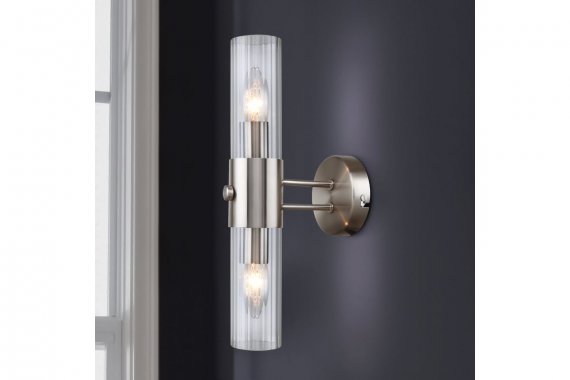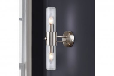 Бра светильник Rivoli Delia 3146-402 настенный 2 х Е14 40 Вт модерн Светильник-бра настенный со стеклянным удлинённым плафоном под 2 лампы - Rivoli Delia (арт. 3146-402). Бра настенное в стиле модерн применяется с лампами Е14 40 Вт, идеально смотрится с лампочками в колбе «свеча». Освещаемая площадь бра – до 6 м2. Размеры бра - 170*100*360 мм. Настенные светильники Delia выпускаются в металлическом корпусе цвета никель сатин. Эти элегантные лаконичные светильники настенные подходят в интерьеры стилей модерн, классика, современная классика. Бра Rivoli Delia можно располагать на стену как вертикально, так и горизонтально. Коллекцию дополняют: большие люстры под 12 и 16 ламп (арт. 3146-312 и 3146-316), подвесной светильник под 2 лампы (арт. 3146-201).